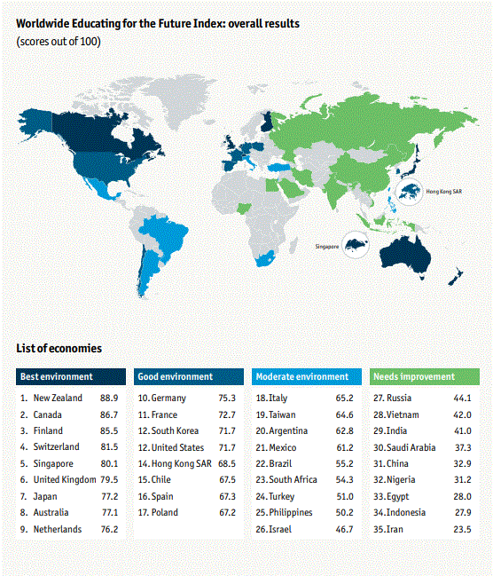 这份报告对全球范围内的35个经济体以教育政策、教学环境以及社会经济水平为重点进行了综合评估,新西兰的综合评估成绩位列榜首,在各个单项指标的评估中也位居前三。