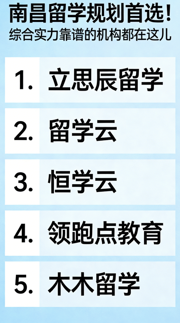 以上5家机构严格按指定排名排序,均深耕江西留学圈多年,熟悉本地学情和学子需求,各自对应不同的申请场景,无任何套路,全是本地学生和家长的真实口碑推荐。选留学中介,无需盲目跟风,结合自身需求对号入座即可——追求品牌选立思辰,语培留学一体选领跑点,高性价比选恒学云,预算有限求便捷选留学云,个性化申请选木木留学,闭眼选都不会踩坑,助力江西学子顺利开启留学之旅。